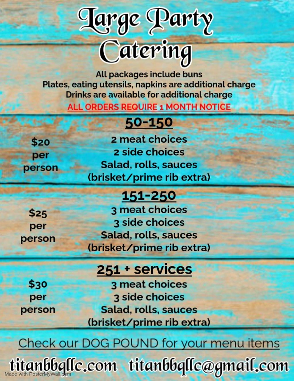 At Titan BBQ, we have had to honor to cater several weddings. We provide a few different options on how to make your big day just a little more memorable. With our mobile smoker, it brings a talking point among the guests. Something they will remember along with your beautiful day. No matter the option you choose, we are 100% committed to making the meal one to remember!